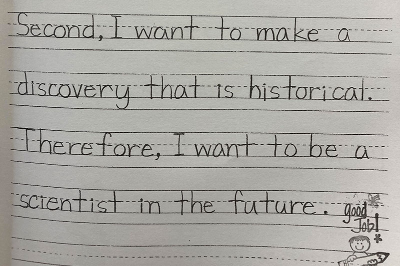 定型文を多書きすることで「書くこと」の ハードルを下げ、英検の「ライティング」にも対応できるように導きます。これは「中学に行ったら、発音もほめられるし、リスニングやリーディングもできるけど、書くことができない」という卒業生の声を反映させた取り組みです。
