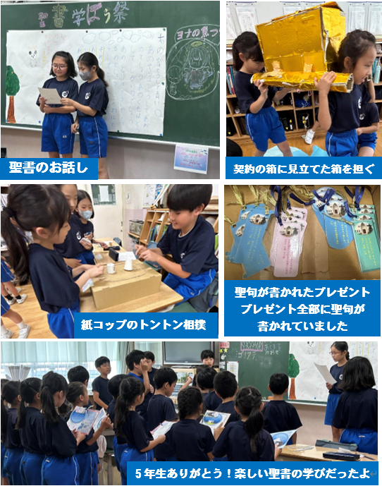 5年生たちは2年生に聖書のお話をして、そのお話に関係するゲームを企画し、楽しんでもらうことにしました。