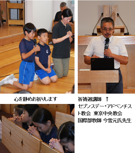 祈祷週期間中は、クラスでもその日の牧師先生のメッセージを振り返り、感想を分かち合ったり、組になってお祈りしたりします。また、昼休みの「祈りの時間」は希望者がチャペルでお祈りできる時間になっています。個人的に、お友だちと、先生と、異学年同士でお祈りする姿が見られます。この祈祷週では初めて、2日間連続で全校児童がチャペルに足を運び、お祈りする時をもちました。まずお祈りしてから残りの昼休みの時間を過ごした子どもたちでした。