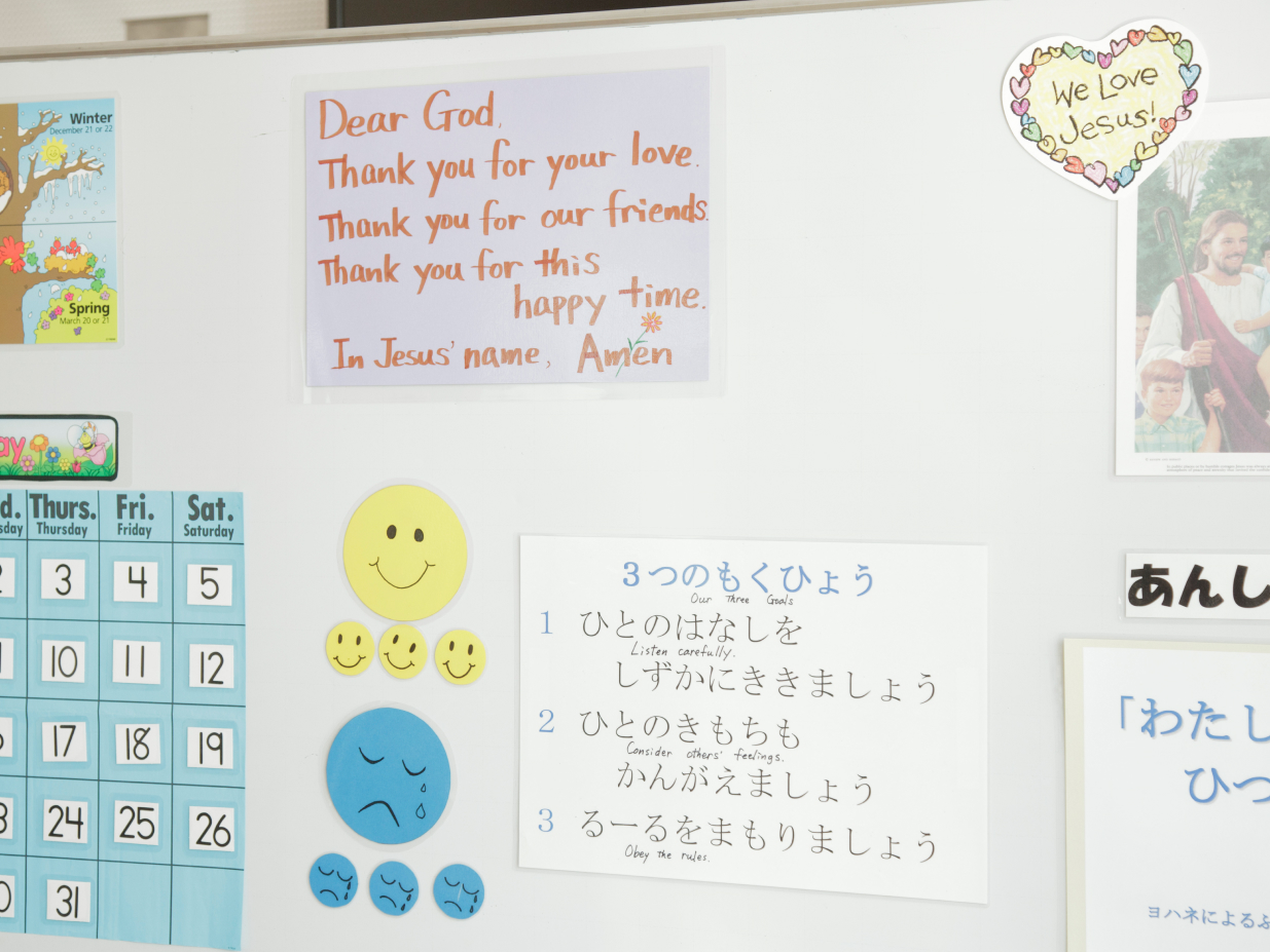 オープニングでは、挨拶、歌、お祈り、カレンダー活動を行い、クロージングでは、クラスの目標の振り返りをし、歌とお祈りでクラスを閉じます。