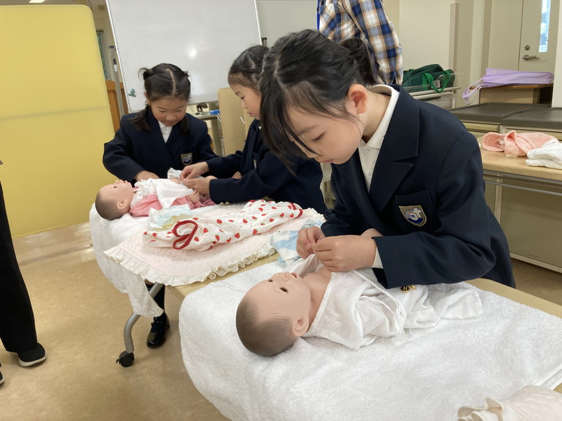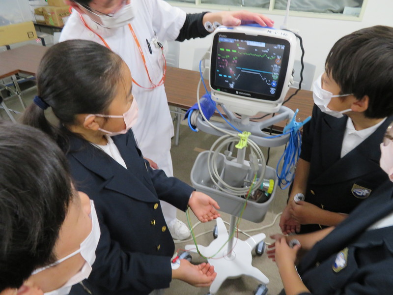 系列大学・病院の協力のもと、専門的な学びと体験を行います。胎児の成長について学び、赤ちゃん人形を抱いて新生児の重さを体感するほか、聴診器を使って自分の心臓音を聴き、自分のいのちについて考えます。また、医療機器に触れる体験を通して、「いのちを守る現場」への理解を深めます。「一人ひとりのいのちの価値は、どんなに高額な医療機器が並べられても比べものにならず、値段がつけられるものではありません。」と教えられ、医療現場での学びを通していのちの大切さを心に刻むのです。