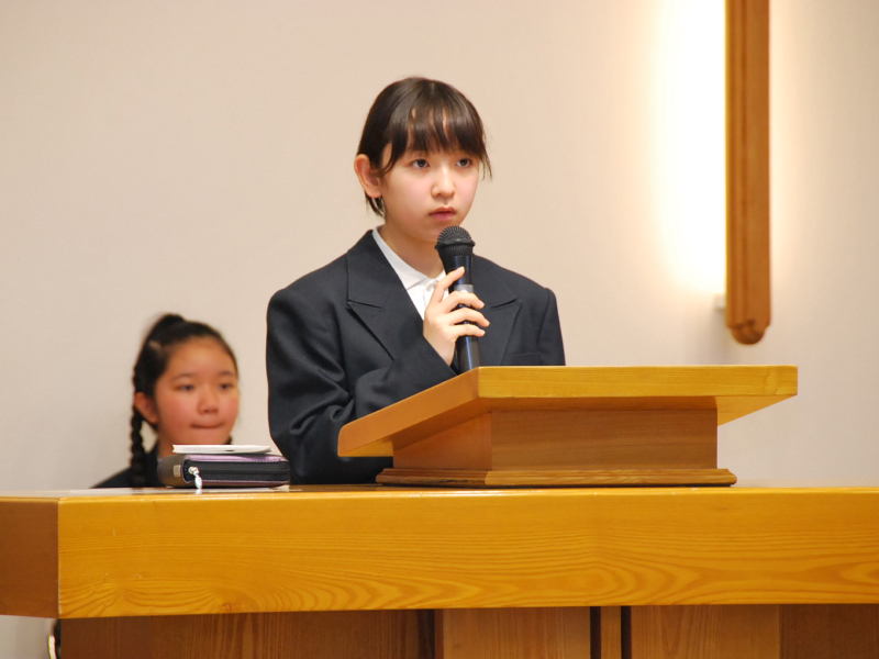三育小学校での学びや、神さま、聖書、先生、友達などとの親密な関係性を通して、三育小学校でなければ得られなかったかけがえのない学びや体験、心の交流、そして自分の中心に据えるものは何か、本当に大切なものは何か、誰かの必要を満たし、分かち合うことの大切さに気づいたことなどを、三育の学びの集大成として自分の言葉で語ります。